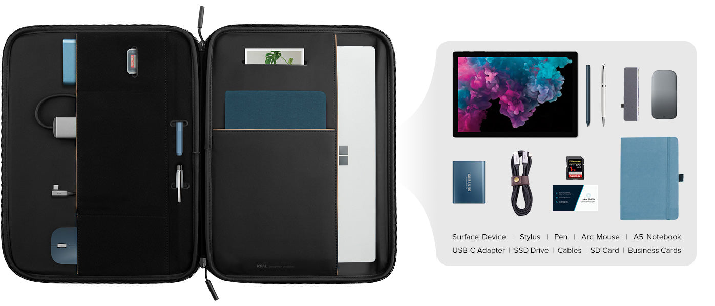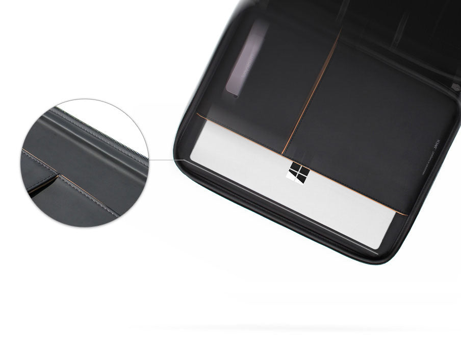 Conçue pour compléter le look élégant de votre appareil Surface, la pochette Jasper Executive Folio est une solution de transport élégamment compacte. Les poches de rangement internes en font un outil de transport efficace pour vos accessoires essentiels et la doublure rembourrée et le pare-chocs DropGuard protègent votre appareil des chutes et des impacts inattendus.