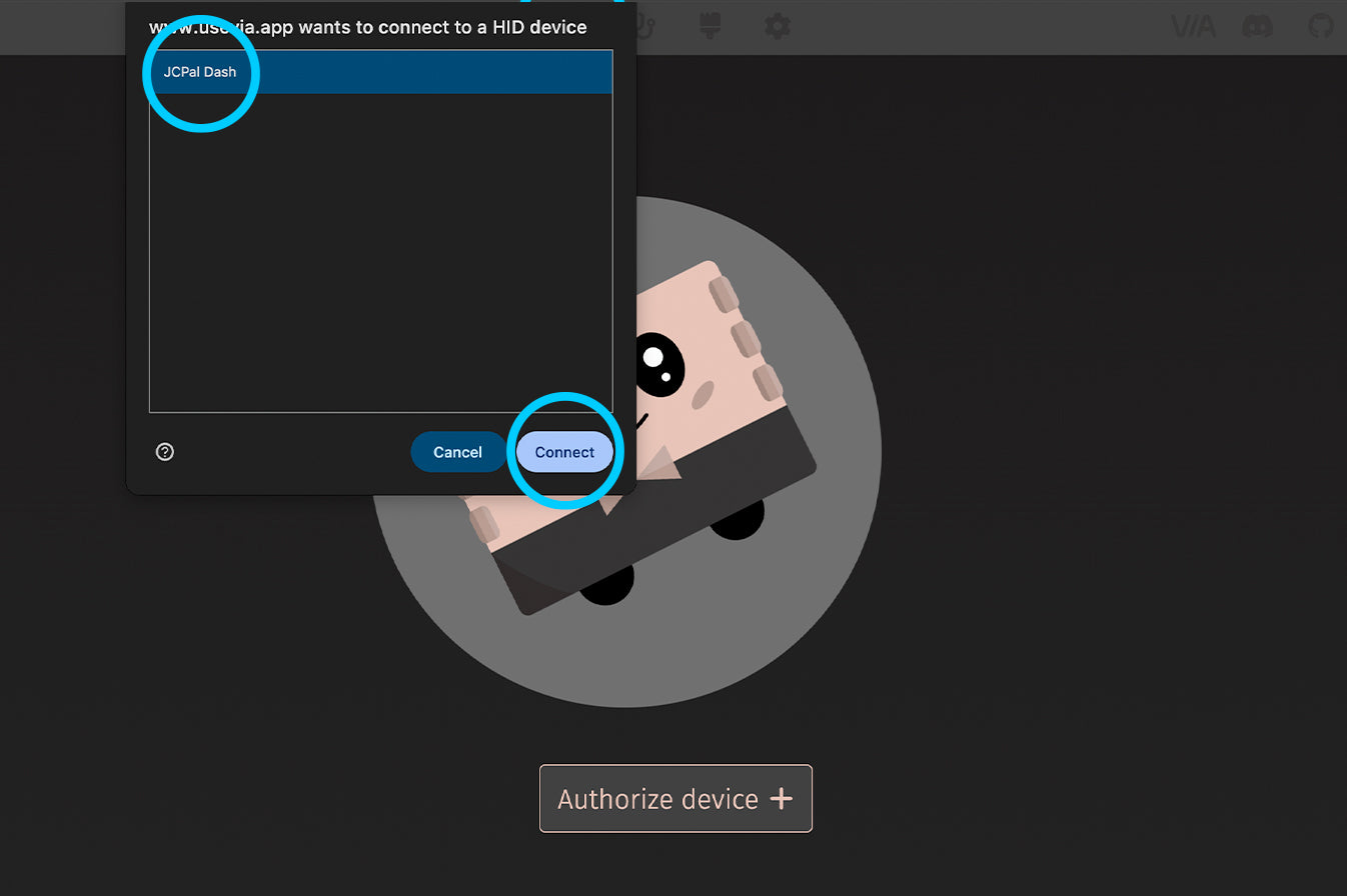 2. Then click the "Authorize device" button to show a list of the connect VIA compatible devices.