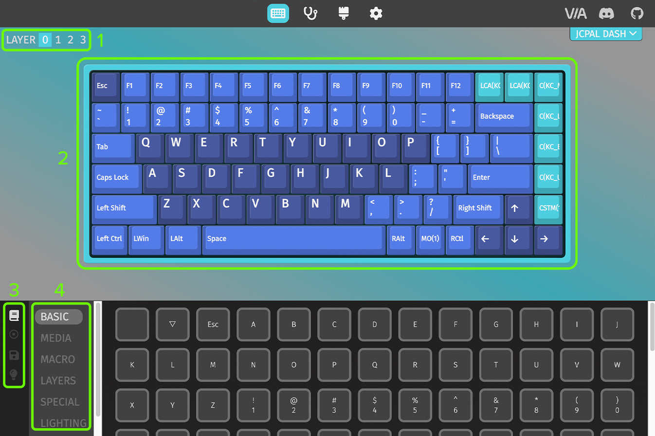 Note: On the Settings page (Gear icon) you can select different colour keycap themes for VIA. We recommend the "Navy Blue A" (shown below) theme as this will more clearly show the different key zones on the Dash.
