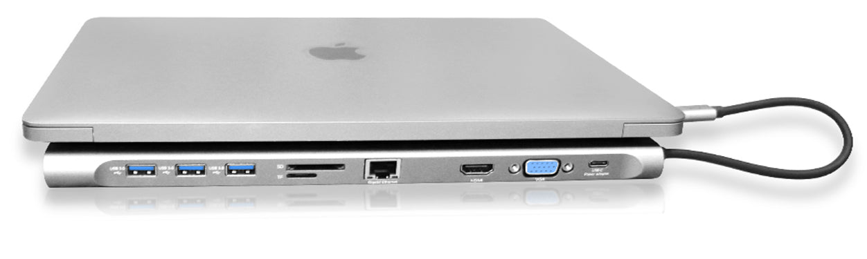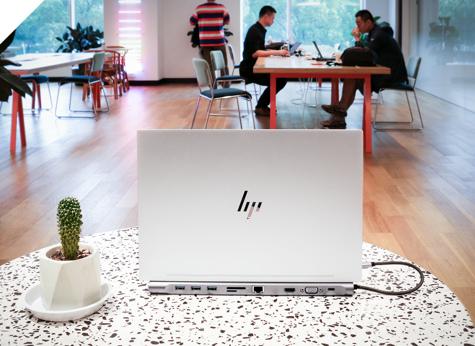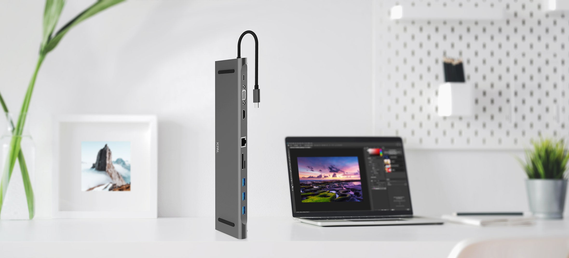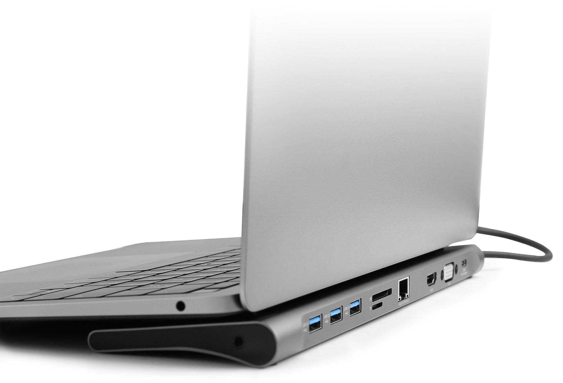 Zaprojektowana, aby uczynić Twoje cyfrowe życie bardziej zorganizowanym i połączonym, stacja dokująca USB-C Ultra Slim Dock zapewnia 10 dodatkowych portów łączności z Twoim urządzeniem. Elegancki kształt klina pozwala umieścić stację dokującą pod laptopem, lekko ją podnosząc, aby zwiększyć przepływ powietrza, jednocześnie utrzymując szereg portów w zasięgu ręki. Wystarczy podłączyć kabel USB-C do urządzenia, aby powiększyć pulpit o dwa dodatkowe wyświetlacze, podłączyć urządzenia peryferyjne, takie jak dyski twarde i drukarki, do szybkich portów USB 3.0 lub importować zdjęcia i filmy z karty SD aparatu. Stacja dokująca jest również wyposażona w port wejściowy USB-C PD, dzięki czemu możesz zasilać laptopa podczas pracy.