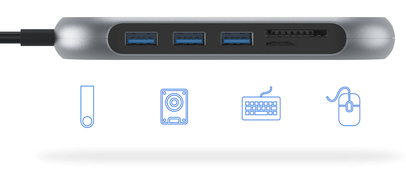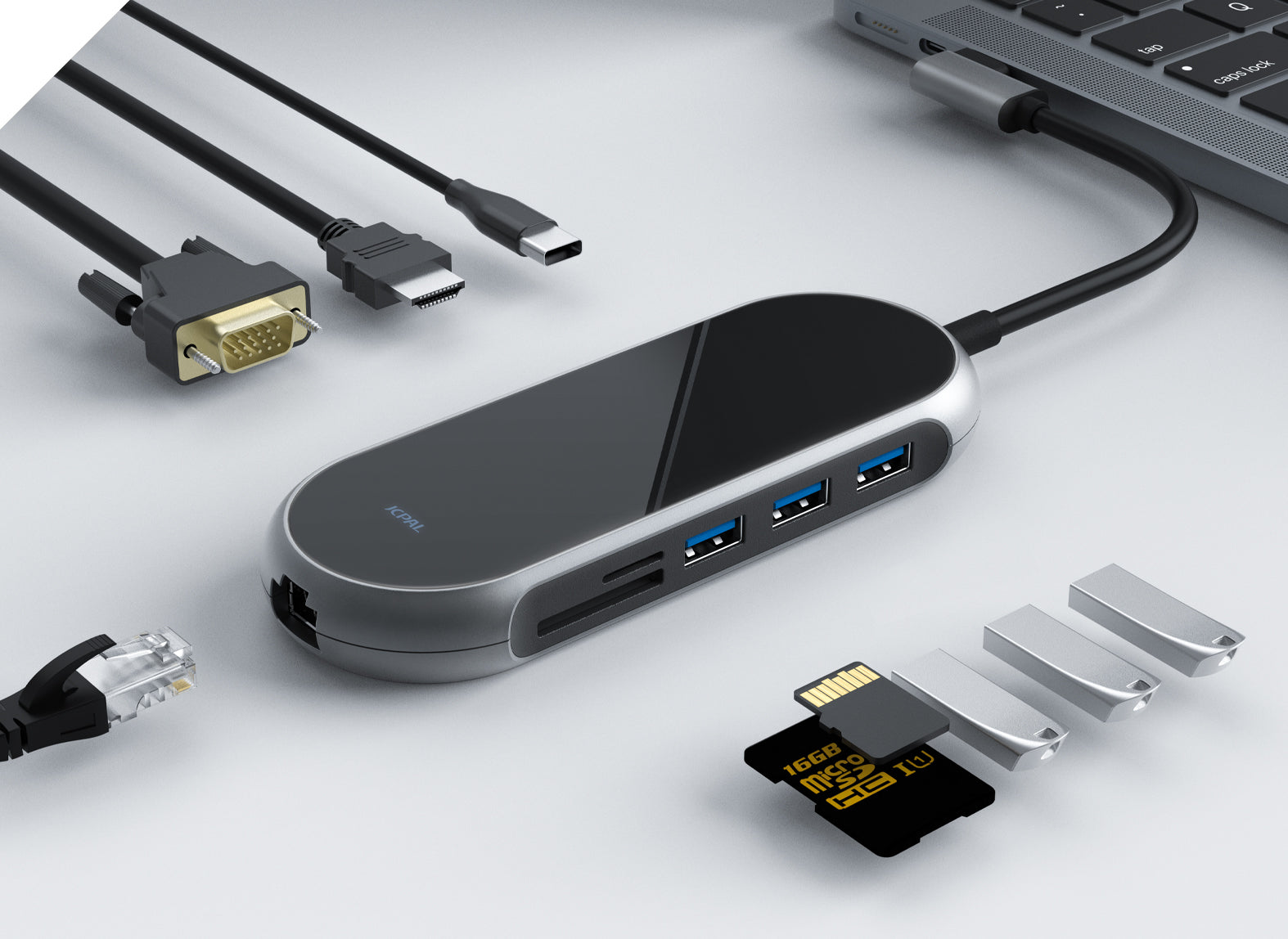 Designed for digital creatives, the Onyx USB-C 9-Port Hub is a sleek and compact way to add an array of ports to your MacBook or USB-C compatible device. Featuring 4K HDMI and 1080P VGA ports, you can extend your display across two external monitors for increased efficiency. Three high speed USB 3.0 ports allow you to connect external hard drives or keyboards, while the Ethernet port supports 10/100/1000Mbps network connections so you can browse the internet at faster-than-WiFi speeds. Upload photos from your camera or smartphone using the SD and microSD card slots, and keep your device charged with the USB-C PD power input that supports up to 100W power pass-through.