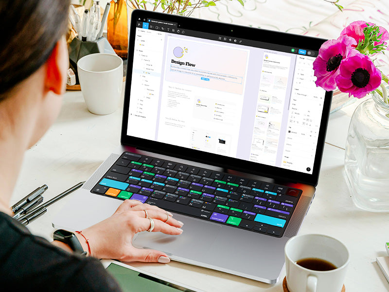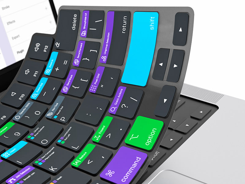 VerSkin is the versatile companion for your laptop, protecting it from liquid and crumb spills while helping teach you the most useful shortcuts for Figma. The color-coded shortcut guide is printed directly on the keys providing a quick reference to over 60 frequently used shortcuts, helping you edit faster than ever.